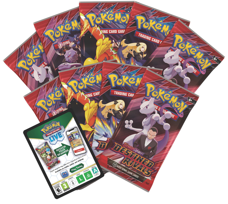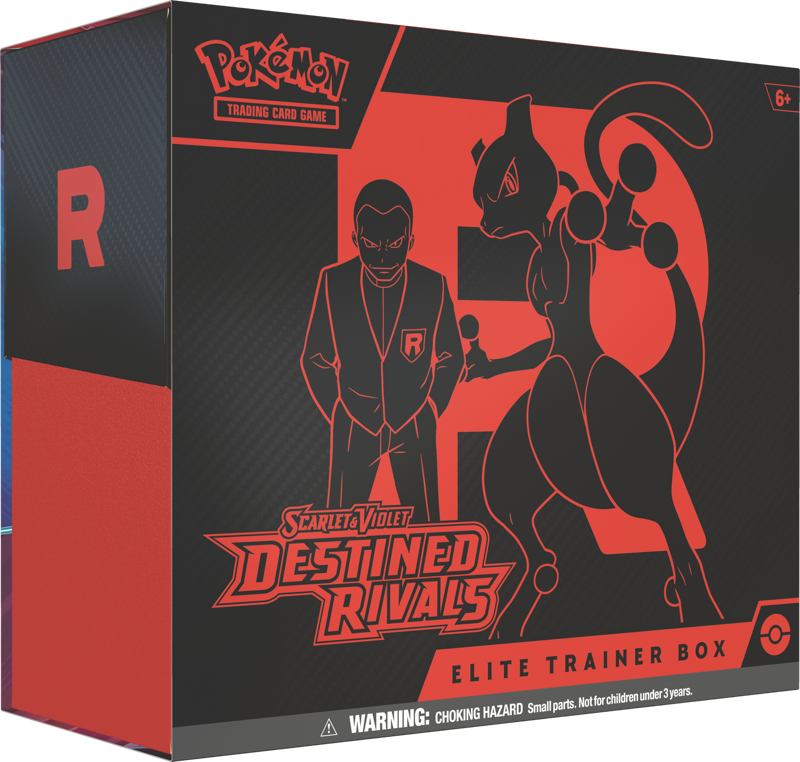 Pokémon Trainers, be on high alert! The nefarious Team Rocket is setting its latest plan into motion, and heroic Trainers are racing to stop it. Join forces with the likes of Cynthia and Garchomp ex, Ethan and Ho-Oh ex, or Arven and Mabosstiff ex… Or reconsider your loyalties and fight alongside Team Rocket’s Pokémon like Mewtwo ex—under the command of Giovanni! Choose a side, assemble your allies, and battle boldly in the Pokémon TCG: Scarlet & Violet—Destined Rivals expansion!
